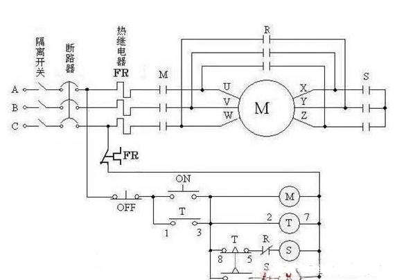 R接觸器,為啟動之后,把電機(jī)繞組首尾連接起來。即U-Z,Y-W,X-V三個繞組的三角形接法。 T時間繼電器,起動時,比如要讓電機(jī)在5秒內(nèi)完成起動進(jìn)入正常運(yùn)轉(zhuǎn)狀態(tài),就可把時間繼電器設(shè)定到5秒