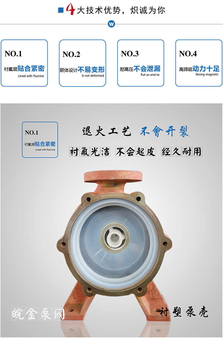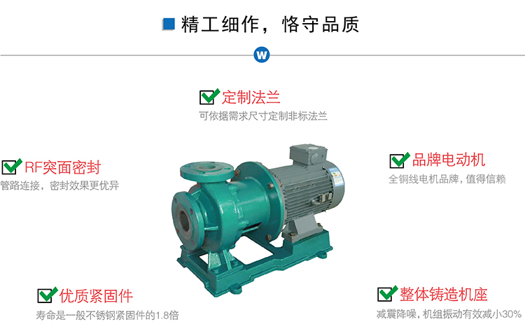 氟塑料磁力泵又稱其為氟塑料磁力離心泵、襯四氟磁力泵、氟塑料磁力驅動泵、耐腐蝕磁力化工泵,CQB-FJ襯塑磁力泵是我公司氟塑料磁力泵中的全新升級款型。氟塑料磁力泵另有:CQB-F經(jīng)典型、CQB-FA長支架型、IMD后拉式重型。