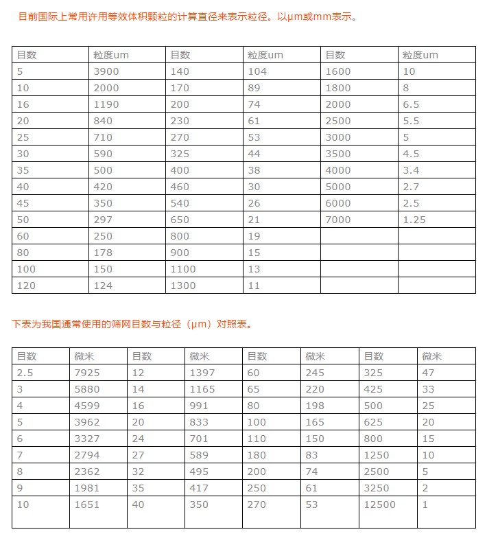 計(jì)量單位目粒度是指原料顆粒的尺寸,一般以顆粒的大長度來表示。網(wǎng)目是表示標(biāo)準(zhǔn)篩的篩孔尺寸的大小。在泰勒標(biāo)準(zhǔn)篩中,所謂網(wǎng)目就是2.54厘米(1英寸)長度中的篩孔數(shù)目,并簡稱為目。